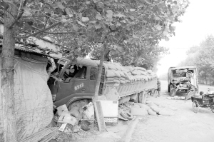 昨日,记者在现场看到,满载水泥的车牌号为豫PY872*的货车,半个车头钻进了路边商店,车身被一棵杨树仅仅卡住;车牌号为豫PKA989的运沙货车的驾驶室则被撞毁(如图)。