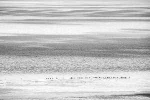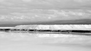 在盐湖边放眼望去,极远处才可以见到顶上积着雪的群山,两边的盐湖如同草原般开阔,湖里的卤水纯清碧绿,不见一丝生物迹象;只有那些如工艺品般的结晶,静静地点缀在湖中,有的像欲飞还立的飞禽,有的像凝固不动的走兽,千姿百态。大风毫无阻挡地在湖面上肆意行走,使放晴后蓝天白云的倒影全都隐藏在被吹皱的水纹里。只有远处祭湖的嘛呢堆边的幡旗,色彩斑斓,随风而舞。