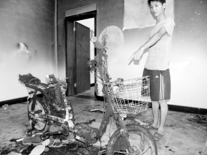 昨天下午, 记者来到康先生家中,一进门便闻到一股刺鼻的焦煳味。看着已被烧成“骨架”的电动车(如图),康先生说:“电动车着火是晚上11点多的事,我在卧室休息时突然闻到一股浓烈的焦煳味,打开门一看,黑烟和火迎面扑来,我急忙关上门,通过窗户向外边的人求救。”后来,在邻居的帮助下,大火很快被扑灭,康先生一家三口逃离了“火海”。