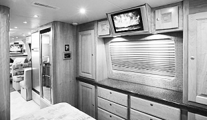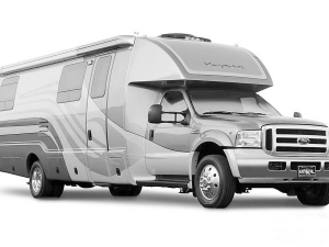 福特F550高级越野房车(图二)外观大气厚重,2.54米的超宽车身,前脸有大面积的镀铬装饰,极具视觉冲击力。车内配置一如既往的奢华:地毯和瓷砖地面、高级皮革天棚及墙面、豪华老板坐椅、32英寸纯平彩电、高级皮沙发、豪华木制家具、卧室里15英寸纯平彩电、豪华双人床、环绕立体音响、卫星接收仪;厨具包括微波炉、冰箱、冷藏柜、3个燃气灶、水槽、豪华碗柜、Kardon仿大理石桌台面等;浴室为带采光天窗的淋浴。这是一个豪华的移动世界。