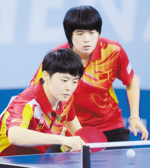 右图:中国队选手饶静文(左)/马越斐在比赛中,她们在双打比赛中以3比0战胜日本选手松泽马丽娜/小野思保。