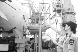 8月16日,江苏江阴边检站警官对“向阳红09”船进行船体检查。当天,搭载圆满完成5000米级海试任务的“蛟龙”号载人潜水器的母船“向阳红09”船顺利返航,抵达江苏江阴口岸锚地。新华社发
