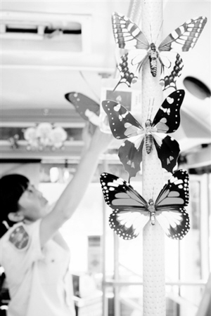 8月17日,公交驾驶员在车厢内布置仿真“五彩蝴蝶”。当日,山东潍坊市公交30路的一辆公交车车厢被20多只仿真“五彩蝴蝶”装饰一新,为乘客提供了一个良好的乘车环境。新华社发