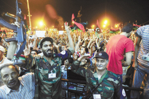 8月21日凌晨,反对派支持者参加在利比亚班加西举行的游行集会。利比亚反对派军方发言人艾哈迈德·巴尼20日晚向记者确认,利比亚反对派已占领首都的黎波里的国际机场和一个军火库,的黎波里市内发生全面骚乱,游行示威者已走上首都的黎波里的数个街区街道。 新华社发