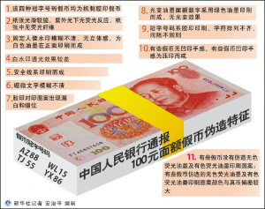 “真币里的主席头像左眉毛与眼睛很清晰地分开,新版假币里头像的左眉毛与眼睛却是相连的。”听完讲述,货运部附近一家银行的工作人员给记者和张先生支了一招。那么,对于市面上出现零星的新版假钞,市民应该如何识别呢?这位工作人员除了现场支招外,还利用自己的专业知识给市民开出了一剂“识假良方”。他说,最管用的方法就是运用“看、摸、听、测” 等方法进行综合识别。首先,从票面的整体颜色来看,当假钞和真币放在一起时,可以发现假钞的颜色相对要白一点。从票面立体感上看,真币立体感相对强一点,假钞相对平板,无立体感;从票面水印看,真币100元水印背景为白色,而假钞的100元水印背景是黑色,且呈半梯形。这位工作人员在此还提醒广大市民,如果收到此类假币后,应及时上交银行处理,也可以选择直接报案,提供线索、协助警方进行处理。如在明知是假币的情况下仍然进行使用流通,公安机关将会依法追究当事人刑事责任。