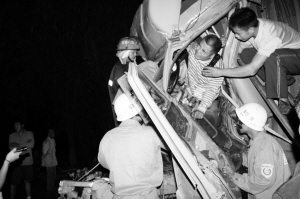 指挥员勘察现场发现,昌河车内有3名被困人员,意识清醒,其中两人被变形的车座卡住双腿动弹不得。指挥员立即下令迅速实施现场警戒,利用破拆工具撑开救援空间,同时安抚受伤人员情绪。经过5分钟的紧张救援,3人被顺利救出。据围观群众反映,事故共造成5人受伤,其中两人在事故发生后已被当地群众自发救出送往医院救治。