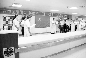 在肿瘤科,洋溢着浓浓的人文关怀气息。该科主任张跃强说,一个优秀的医生不仅要医术高明,更需要具备高度的仁爱精神和高尚的道德人格。肿瘤科常年住的都是中晚期肿瘤病人,病人入院时大多情绪不稳定,沮丧绝望,对生活失去信心。对此,张跃强和他的同事一直用心服务,通过细节展示作为医者的关爱与尊重,帮助病人调整心态、稳定情绪。他们查病房时握住病人的手,轻轻拍抚病人的身体。“因为医生就是病人的求生稻草,只有医生能给病人活的信念和生的希望。”张跃强说,他们还采用良好的语言暗示提升患者治疗的勇气,冲淡疾病带来的苦痛。每到查房时,病房里总是充满了欢声笑语。他们熟悉每一位病人,能亲切地唤出病人的名字。患者在出院时都恋恋不舍,很多患者和医生、护士成了朋友。