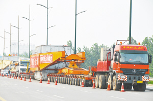 据了解,这两个变压器是分别从沈阳变压器厂和西安变压器厂通过水路运到周口的,一个是7月运到的,一个是本月中旬运到的。因为大桥很快就将加固完毕,昨天上午这两个变压器从船上卸下,由4辆大车拉到周口大道桥南头,准备出发。