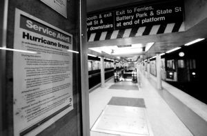 从27日中午12时开始,纽约大都会捷运局所属的公共汽车、火车、地铁全面停驶,这一系统的日客运量在850万人次左右,这是该市历史上第一次因为应对自然灾害而宣布运输系统停运。如果风速超过每小时96公里,州政府将关闭通向曼哈顿的多条桥梁,保留海底隧道和三洲桥等桥梁通行;纽约州际公路和主要高速公路也可能关闭。