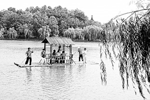 独自一个人,竹排可以将你带入桃花源的境界。将竹篙横在腿上,将双脚伸入水中,让清凉渗透心田,任竹排随意游;或者将竹排撑到岸边,停在柳荫下,清风拂面,柳枝轻摇,一任柳丝在你的面前飘拂,抚摸你的脸颊,体味清静无为独处时的妙处。
