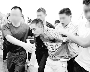 阳兵被击伤后,被4名警察反拧着双臂,押下车来。