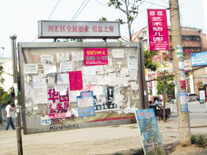 在周口育新商业街东路北侧,矗立着一座标明“川汇区全民创业信息之窗”的宣传栏,但是整个版面上却被卖药、售房等方面的一些野广告长期占据着。许多渴望了解创业信息的市民盼望有关部门尽早清理上面的“牛皮癣”,让其发挥应有的作用。