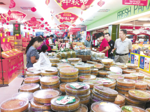 昨日,在市区七一路一大型超市里,购买月饼的市民络绎不绝。中秋节临近,我市各大超市精心准备了各种口味的散装、礼盒装月饼,均摆在显要位置供市民选购。记者 王映 摄