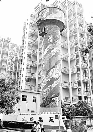 这是9月3日拍摄的小区内的水塔。在郑州市西站北街的怡馨苑小区,有一座上世纪70年代修建的老水塔。据小区居民介绍,这里原先是一家企业,后来厂房拆除建成生活小区,只留下这座水塔。作为老工厂的见证,人们舍不得拆掉它,就为它贴上彩色瓷砖,拼成和平鸽、蓝天和白云等图案,成为小区一景。新华社发