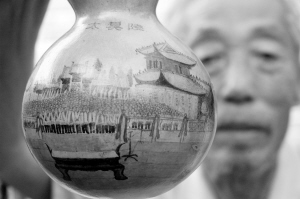 昨天,记者在淮阳县北关一家属区,见到了在葫芦上作画的陶明训老人和他的“公祭伏羲”作品(如图)。这幅葫芦上的“公祭伏羲”图,太昊陵庙宇雄伟壮观,统天殿月台广场上,是公祭人祖太昊伏羲祭祀大典的场景,广场上整齐站列着数千名海内外羲皇子孙祭拜伏羲。作品景物逼真,人物栩栩如生。