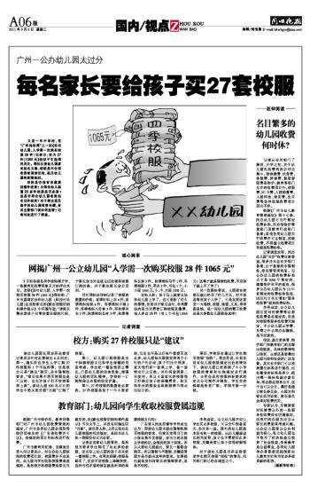网揭广州一公立幼儿园“入学需一次购买校服28件1065元”