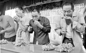 当日上午,商水县第三届葡萄文化节启动仪式过后,吃葡萄大赛接着上演。“每人跟前一兜葡萄,用最短的时间吃完的人为胜利者。”11时15分,随着主持人一声令下,参赛选手迅速向自己面前的1.25公斤葡萄发起了“进攻”(如图)。他们或“囫囵吞枣”、或细细品味,台上吃得热闹,台下笑声、加油声更是此起彼伏。