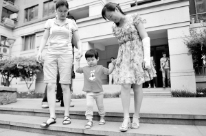 9月12日,吴菊萍(右)牵着妞妞在小区散步。