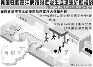 当地时间下午1时30分左右(北京时间下午5时),喀布尔市中心使馆区附近首先响起多次巨大爆炸声,接着传出枪声。使馆区内有美国大使馆、英国大使馆和其他国家外交使团驻地以及驻阿富汗国际安全援助部队总部。