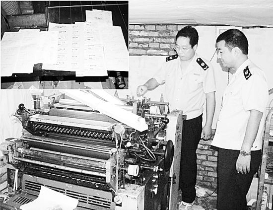 今年以来,市国税局联合公安机关从制、售、用三方面入手,严厉打击各类发票违法犯罪活动。截至目前,执法人员已查处发票违法犯罪案件25起,捣毁发票制假窝点14个,收缴制假设备19台,抓获犯罪嫌疑人10名,查获假发票630万份,罚款13万元。图为查处一印制假发票现场。 晚报记者 李瑞才 通讯员 金耀民 王高洁 摄