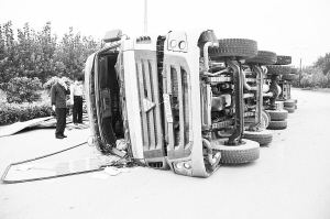 昨天下午,周口市东新区文昌大道和周口大道的转盘路口处,一辆大货车翻倒在地,驾驶室内的人员因受伤已去医院接受治疗。