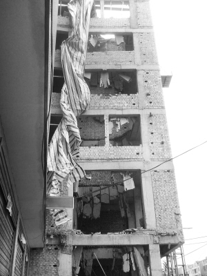 昨天上午,记者再次赶到事发现场进行采访。在现场,记者发现几名民工已从6楼楼顶自上而下放置了一块长长的花塑料布,用于遮挡西侧的楼体。