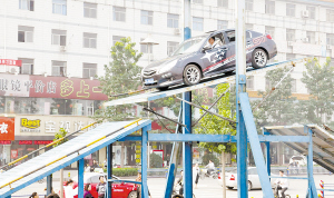 当天,车手在五一劳动广场的车技表演,吸引了众多前来观看车展的市民。只见供表演用的高台约有四五米,由3块钢板组成,两边的钢板是倾斜、固定着的,最高处的那块钢板则如跷跷板,可两边摆动。车手驾驶斯巴鲁森林人,快速驶向高台,停在最高处的钢板上,让钢板缓缓保持水平,然后缓慢从另一侧驶下。