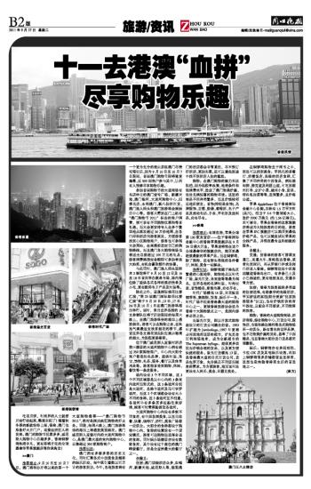 推荐理由:9月10日至10月7日,澳门将举办开埠以来的第一个大型购物盛事——“澳门购物节2011”,绝对是国庆疯狂购物的好去处。同期,每周六晚上,澳门旅游塔旁的海面上将盛放美丽烟花。澳门威尼斯人度假村内的大运河购物中心,是澳门最大型的室内购物中心,云集超过350家购物商户。