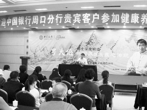 9月25日,中国银行周口分行在周口饭店举办客户答谢会。该行与来自我市各县(市、区)的客户举行交流活动,并请来北京中医药大学诊断学博士、中央电视台《百家讲坛》知名专家罗大伦教授为大家讲授中医养生之道。 图为活动现场。