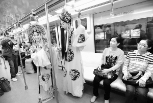 9月27日,昆曲演员在南京地铁二号线列车车厢内表演昆曲名段。当日,“昆曲大美,地铁有戏——昆曲进地铁活动”在南京举行。来自江苏省演艺集团昆剧院的昆曲演员在地铁内为乘客表演昆曲经典曲目。