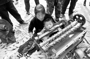 本报讯 10月6日,由于太康县高朗乡一名6岁男童的右手不慎卡在玉米剥皮机里(如图),鲜血直流,闻讯赶来的消防官兵决定切割开机器的滚轴。见滚轴切割到一半无法继续操作,指挥员便指挥战斗员用液压扩张器对滚轴进行扩张。10分钟后,随着“嘣”的一声响,滚轴被成功扩开,男童的右手随之被取出。