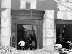 周口市区人民东路附近的一处拆迁房屋虽然已成烂尾楼,但昨天上午记者在此看到有人居然在里面摆起了牌摊,10多位居民在此悠闲地打牌。