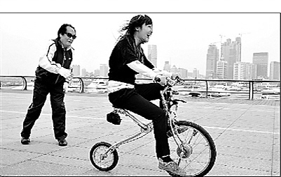 10月15日,青岛,市民王振福发明的无链条自行车在奥帆中心吸引了一名女游客试骑。