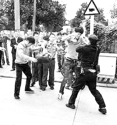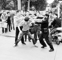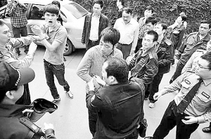 10月17日,宁波鄞州区人民医院北门,一名男子开着路虎SUV执意从医院的进口开出,被保安阻拦。该名男子随后下车动手打人,并从车内拿出棍砸保安室。被带上警车后,其父亲开着奔驰轿车来抢人,父子俩对警察大打出手。打人者父亲陆××,是一家工程公司老总,兼任鄞州下应街道江六村的村支书。儿子曾在英国留学7年。中新 摄