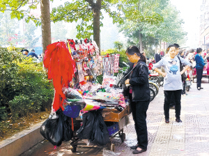 记者在周口市七一路二小门口一个小摊上看到,这里出售的红领巾有化纤和布质两种不同的面料,其中布的1元一条,化纤的0.5元一条。摊主告诉记者,红领巾比较好卖,主要是学校要求佩戴,而有些小学生丢失或忘记戴了,就会临时买一个。记者在附近观察了约20分钟,有七八名学生来买红领巾(如图)。