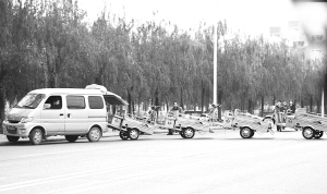 一辆面包车拖了4辆电动三轮车,在道路上大摇大摆行走,过往车辆纷纷避让,这是10月17日傍晚,周口市区交通大道上发生的一幕,目击者都为面包车驾驶者的大胆“创意”捏了把汗。