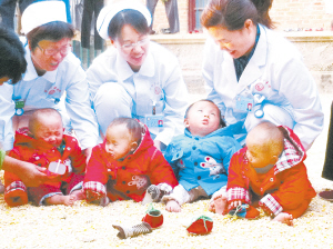 本报讯 2011年1月4日,本报对扶沟固城乡包楼村刘妈妈在周口市中医院产出四胞胎一事进行了报道,如今9个月过去,四胞胎生活状况如何?10月18日,周口市中医院儿科的路主任和护士带着对四胞胎的挂念和医院全体医护人员的关心来到了包楼村特别看望了四胞胎。