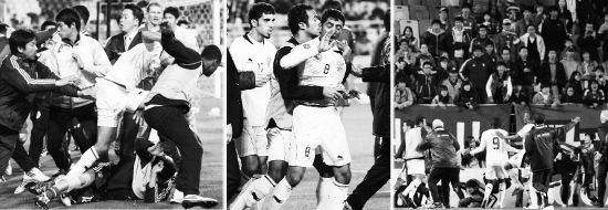 亚冠半决赛 韩国水原三星队与卡塔尔阿尔萨德队群殴 北京时间10月19日,亚冠半决赛韩国水原三星主场迎战卡塔尔阿尔萨德,比赛最后10分钟,双方火药味十足一度导致群殴,甚至有水原球迷冲进场内参与群殴一度导致比赛中断。(周翔 摄)