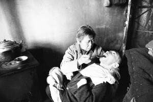 母亲邵秀景搂着杨林给他喂水(2011年3月29日摄)。