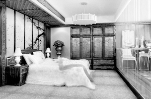 卧室床的精雕细刻,大部分都将被丰厚的床上用品所遮蔽,但绝不会影响到精美雕功的展示。这个连天红中式宫廷家具的百子顶箱柜是最佳的展示舞台。它两件成对,并排陈设。衣柜分两节,上部是顶箱部分,下部则设定为立柜。在顶箱、立柜门、闷仓及牙板上均雕百子嬉戏图,百子百态,情景各异,让人可以驻足流连,颇具观赏性。橱柜的侧面则雕饰着拐子纹、双鱼结等传统中国纹样,洋溢着浓厚的中国文化气息。柜门上选用了厚重的铜合页、面叶和插销,让整个细节部分接近完美。橱柜的四腿成直角,并用铜嵌足,让这份富足在低调中满溢出来。