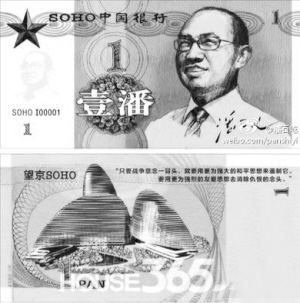 本报综合消息 因评论苹果推出千元以下机型才是对乔布斯的纪念,而被网友调侃应推出每平米千元以下楼盘的SOHO中国董事长潘石屹成为话题焦点。“潘”随即成为房地产计价单位。10月26日,潘石屹在微博发布“SOHO中国银行”发行的“潘币”征求意见版,再度引起话题。网友纷纷质疑此与相关法律相违背,系哗众取宠。