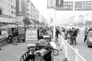 昨日9时许,记者在周口市区八一大道农贸市场北门看到,长达100米的慢车道上,五六十个流动商贩在此摆摊经营。本来只有几米宽的慢车道,因为摊位过多,加上逗留的顾客,骑车从此路过的市民不得不在拥挤的慢车道内走走停停,左闪又拐。还有一些市民干脆直接将车骑上了快车道。晚报记者 朱海龙 摄