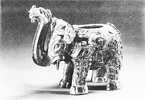 此尊1975年出土于湖南省醴陵县仙霞乡狮子山,乃湖南出土的青铜酒器。象体浑短,四肢粗壮,肥耳,短颈,垂尾,门齿外露,长鼻上扬,作静立状,活生生一个亚洲象的神态。象背上有椭圆形尊口,象腹中空以纳酒,象鼻中空以斟酒,结构极为巧妙。