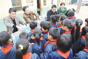 图为周口日报社副总编辑李建成(左三)、泸州老窖博大酒业营销有限公司河南片区主管刑军(左二)、泸州老窖金奖特曲周口经销商周口华富酒业副总经理张国强(左一)、希望小学校长李灵(左四)为学生发放牛奶。(实习生 段鹏 摄)
