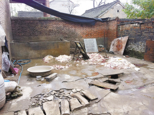 后来工商人员终于敲开了一户人家的门,院内异味很重,地上随意扔着一些猪皮及动物耳朵、内脏等物(如图)。墙角砌了一个水池,池内的水非常浑浊,里面泡的也是这些动物内脏,散发着刺鼻臭味,让人无法接近。11月的天气院子里仍然飞着很多苍蝇。记者看到,这家院子里也垒着一个灶台,上面有满满一锅油。一名工商人员拿棍子搅了搅,沉淀物随即浮上来,油也变得浑浊。工商人员分析,这锅油只是半成品,还要在别处进行再加工,才会进入市场。工商人员向这户村民下达了“现场检查通知书”,责令其立即停止经营。在当天的调查中,工商人员在鲍堂村发现了七八户村民家里在炼制劣质油。