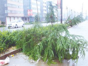 11月8日,在商水备战路南段,风雨过后,路两侧有不少新栽的针叶松倒在绿化带上,市民呼吁相关部门尽快组织技术人员扶起这些倒地的绿化树。