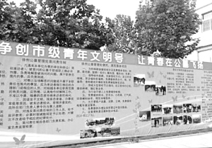 著名体育解说员黄健翔日前在微博发起 “随手拍大标语”的活动,在网友们上传的照片中,徐州公墓管理处张贴的“让青春在公墓飞扬”标语着实雷人。记者在该微博上注意到,红底黑字展板上印有《徐州公墓管理处首问责任制》及《青年文明号创建内容》、《徐州公墓管理处便民、惠民服务项目》及多张照片。该展板上方的“让青春在公墓飞扬”几个白字标语(下图),遭受到网友质疑。