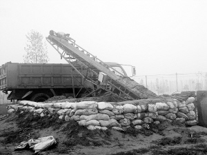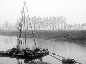 桥的北边也停着一艘采砂船,由于岸上堆放着大量刚抽出的砂浆,5个排水口正不停地向河道排水。清水河两岸因为采砂严重,其中一处农田已经塌陷了几十米长、6米多宽,原来平缓的河床已经变成了峭壁,个别地方还在不停地向下落土块。轻雾中,记者还隐约看到距离该艘采砂船以北的河面上也停有一艘采砂船,“本来长在岸上的树木已经塌陷到河床里去了。”一位群众指着水中的树木气愤地说。