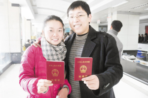 ↓图:来自川汇区的一对新人高兴地向大家展示他们的结婚证。