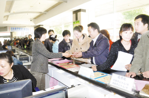 →图:在市行政服务大厅结婚登记点前,前来登记结婚的新人排成了长龙。记者 王映 摄